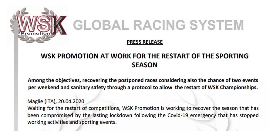 „Celem, do którego dąży WSK Promotion, jest jak najszybszy powrót na właściwe tory bez narażania bezpieczeństwa sanitarnego wszystkich uczestników, zespołów, kierowców i personelu. WSK Promotion rozmawia z Włoską Federacją o opracowaniu protokołu umożliwiającego ponowne uruchomienie rozgrywek. Nowy kalendarz zostanie wkrótce zdefiniowany, aby ukończyć serię WSK Super Master, która została przerwana po wyścigach otwierających w Adrii i Lonato, oraz aby uruchomić WSK Euro Series, WSK Open Cup i WSK Final Cup.” – brzmi komunikat.